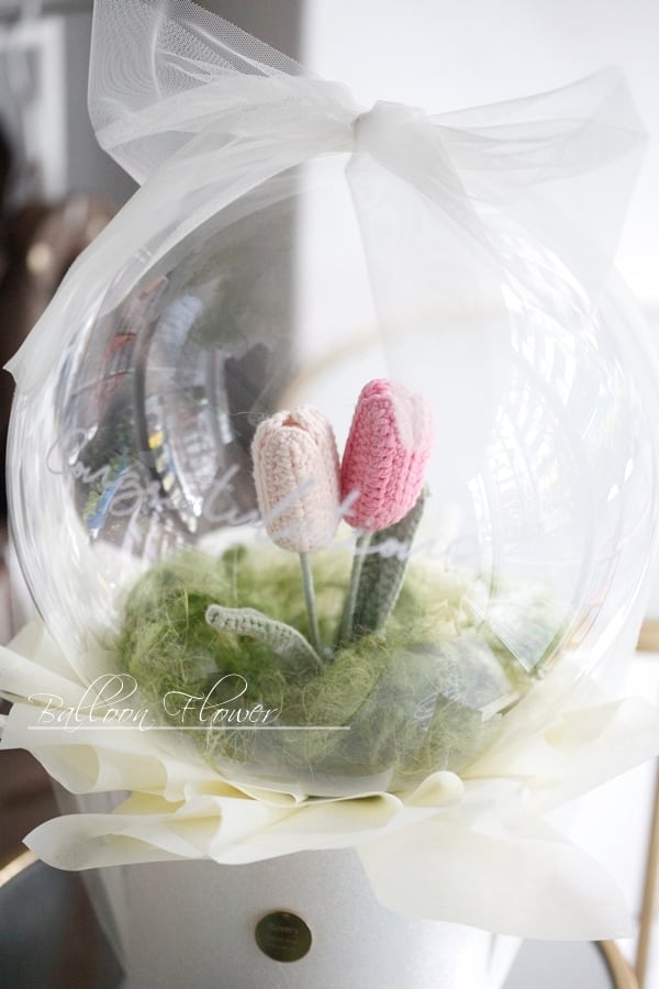 バルーンの中にニット素材の美しいチューリップを2本配置しました。ポイントには柔らかな色合いのウールフラワーを取り入れ、遊び心あふれるバルーンアートを実現しています。